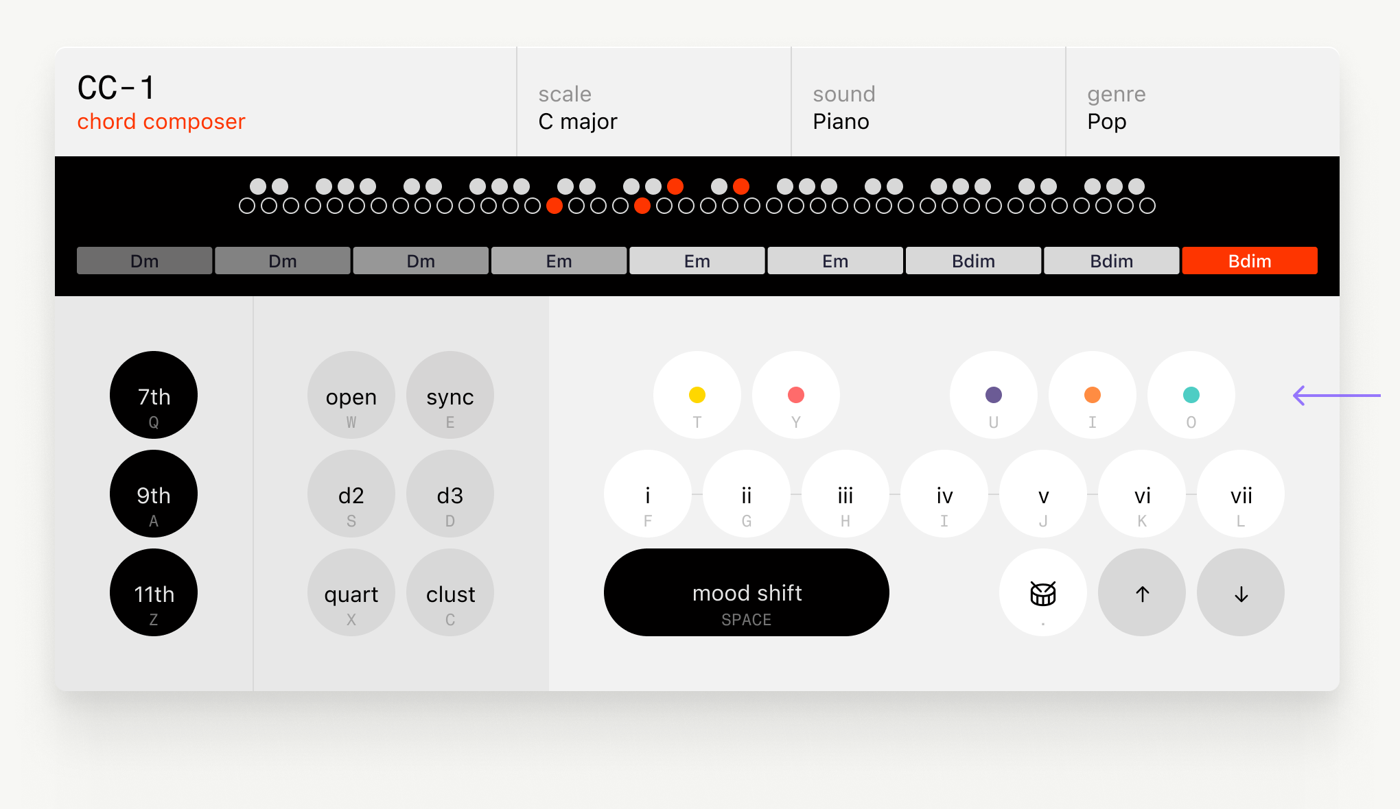 The idea is complex behind the scenes, but the outcome is more intuitive. Now these keys offer different complementary options based on the selected genre and the previously played chord. That combination unlocks a menu of five options, each one tied to a genre-related concept. It’s a bit prescriptive, and I’ll keep adjusting the set of options you can play with, but for now it gives a solid set of alternatives to complement the regular modes as you go. You can even play them randomly to trigger new ideas.